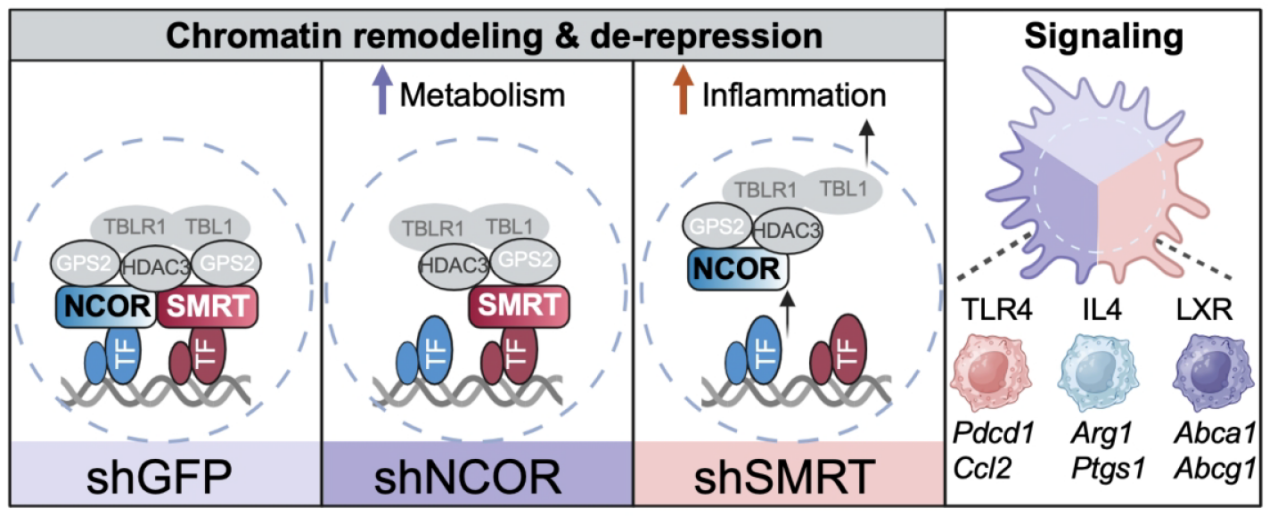 图1. 巨噬细胞中共阻遏复合物NCOR和SMRT的功能差异