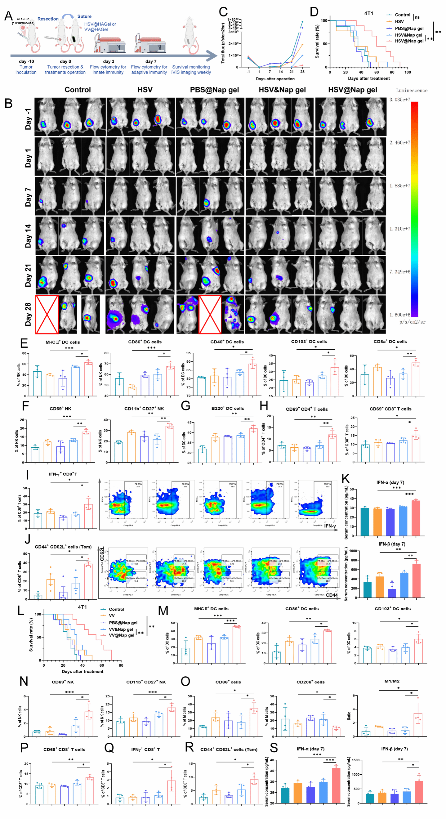 在最新的研究中,六合彩论坛 吴俊华/江春平团队设计并实现了溶瘤病毒(腺病毒adv、单纯疱疹病毒HSV或痘苗病毒VV)始于术中的在手术原位的持续释放。在乳腺癌原位小鼠模型中,肿瘤切除后立即原位植入adv@Nap gel可以持续性激活抗肿瘤免疫,控制肿瘤术后复发。此外,他们还将这一概念扩展到包括其他类型的病毒载体(HSV和VV),并在人源化小鼠肿瘤模型中验证了相关 结果。这些发现为控制肿瘤术后复发方法的开发提供了重要的治疗策略和理论基础。