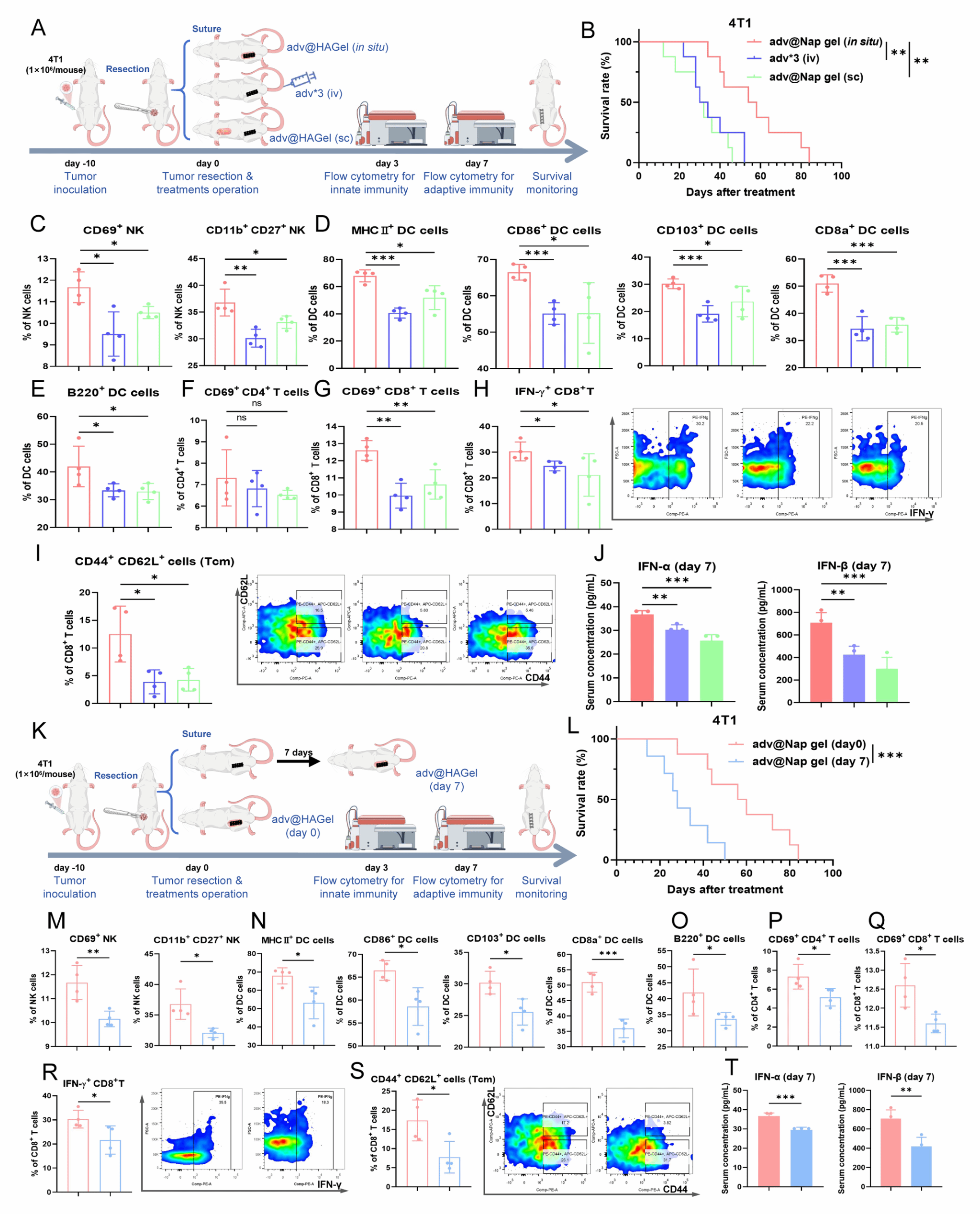 团队使用MDA-MB-231在免疫系统人源化小鼠中成功构建了具有高度临床相关性的三阴性乳腺癌(TNBC)原位模型。,证实了在肿瘤切除后立即植入adv@Nap gel可以诱导抗肿瘤免疫反应和I型干扰素通路的激活,并在手术后控制肿瘤复发,展现了巨大的临床转化前景。