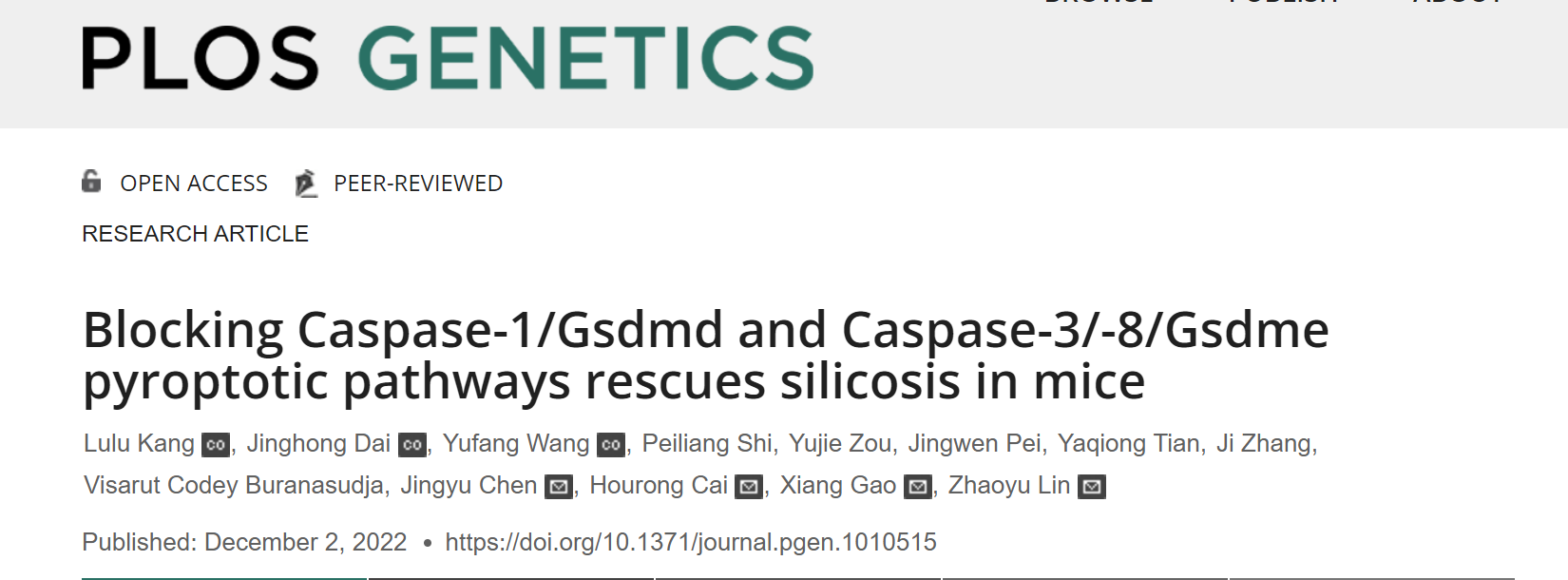 2022年12月2日,六合彩论坛 林兆宇和高翔课题组、六合彩论坛 附属鼓楼医院蔡后荣与无锡市人民医院陈静瑜合作在《PLOS Genetics》上在线发表题为“Blocking Caspase-1/Gsdmd and Caspase-3/-8/Gsdme pyroptotic pathways rescues silicosis in mice” 的研究论文。这项工作发现了二氧化硅诱导的细胞裂解死亡和肺部炎症同时依赖于Gsdmd和Gsdme两条细胞焦亡通路;文章还剖析了在二氧化硅诱导的焦亡中上游的Caspases激活和下游的细胞因子释放,并找到了治疗矽肺病的潜在新疗法。六合彩论坛 林兆宇副教授、高翔教授、六合彩论坛 附属鼓楼医院蔡后荣主任、无锡市人民医院陈静瑜主任是本论文的共同通讯作者;六合彩论坛 康路路、王雨芳以及六合彩论坛 附属鼓楼医院为共同第一作者。本研究得到了国家自然科学基金委、科技部、教育部、江苏省科技厅以及中央高校等基金的支持,同时也得到合作实验室的大力协助与支持。
