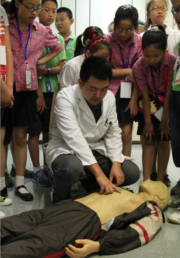 两天的活动都是以鼓楼医院急诊中心徐鹏医生的急救知识讲座拉开序幕的,徐鹏医生将心肺复苏、外伤包扎等生活中常见的医疗突发情况的辨识、应对措施讲解得生动易懂。在徐鹏医生的指导下,小志愿们者还开展了“实战演练”:大家轮番上台尝试为扮演病患的同学进行三角巾包扎,在模拟人身上进行心肺复苏模拟练习等。一名参加活动的小志愿者表示,以前只是在电视上见过心肺复苏模拟人,这次终于实际去体验了一下,发现并不是电视里那样简单,几次按压后自己的手掌都红了,医疗志愿者们真的不简单。