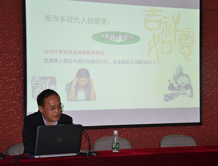 特邀保健专家、市中西医结合医院张明副院长给职工进行亚健康状态的预防与保健讲座。