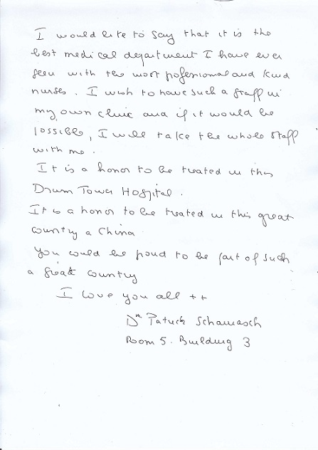 平心而论,作为鼓楼医院的病员真的是我的幸运,作为伟大中国的一位外籍病人,本人深感荣幸!我相信,每一个中国人都为你们伟大的祖国而自豪。