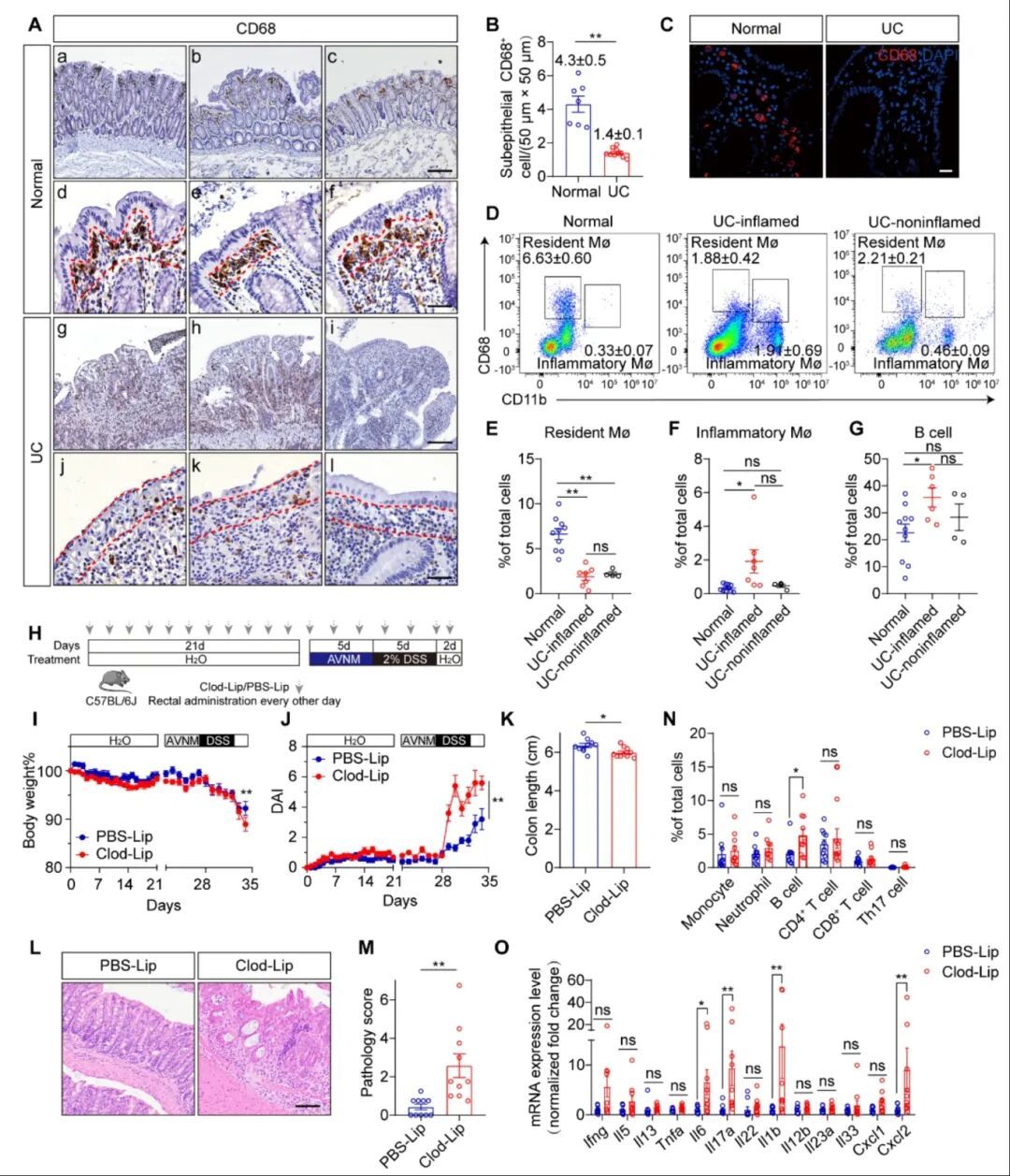 团队通过对UC肠组织观察研究后发现:肠黏膜巨噬细胞屏障在炎症出现之前就已经缺失,提示巨噬细胞屏障破坏可能是肠炎发生的“起始事件”(图1.A-G)。通过化学法或遗传学手段预先清除结肠巨噬细胞,发现动物并不发生肠炎,但轻度损伤刺激后,发生严重的腹泻、便血、免疫学改变等典型UC表现(图1.H-O)。由此进一步证明巨噬细胞屏障破坏是肠黏膜破坏的“起始事件”,可导致肠炎敏感性显著提高。