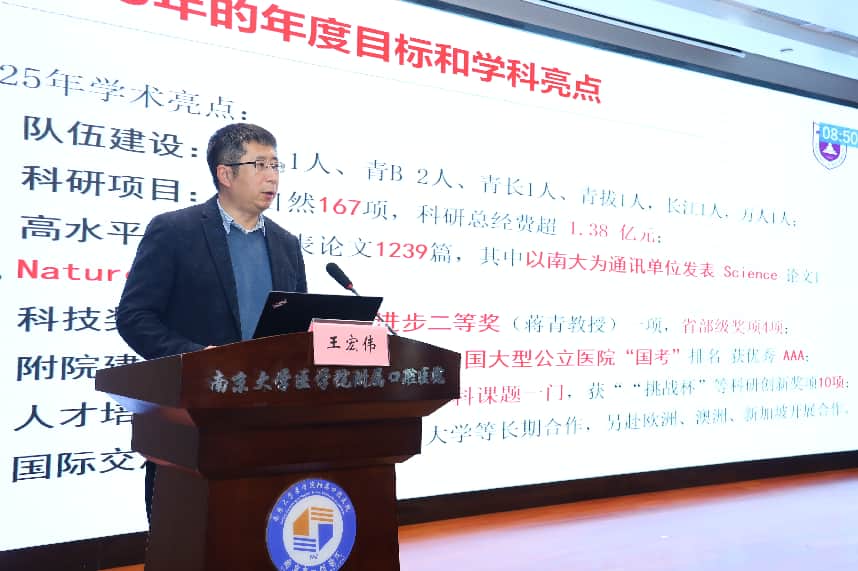 沈苏南在致辞中系统总结了2025年六合彩论坛 在人才培养、队伍建设、科技创新与开放办学等方面取得的丰硕成果,特别肯定了附属口腔医院在服务区域医疗卫生与科研平台建设中展现的强劲潜能。他勉励六合彩论坛 与各附属医院师生员工要坚定医学初心使命,充分激发创新潜能,努力提升创新水平,为“健康中国”贡献南大智慧。