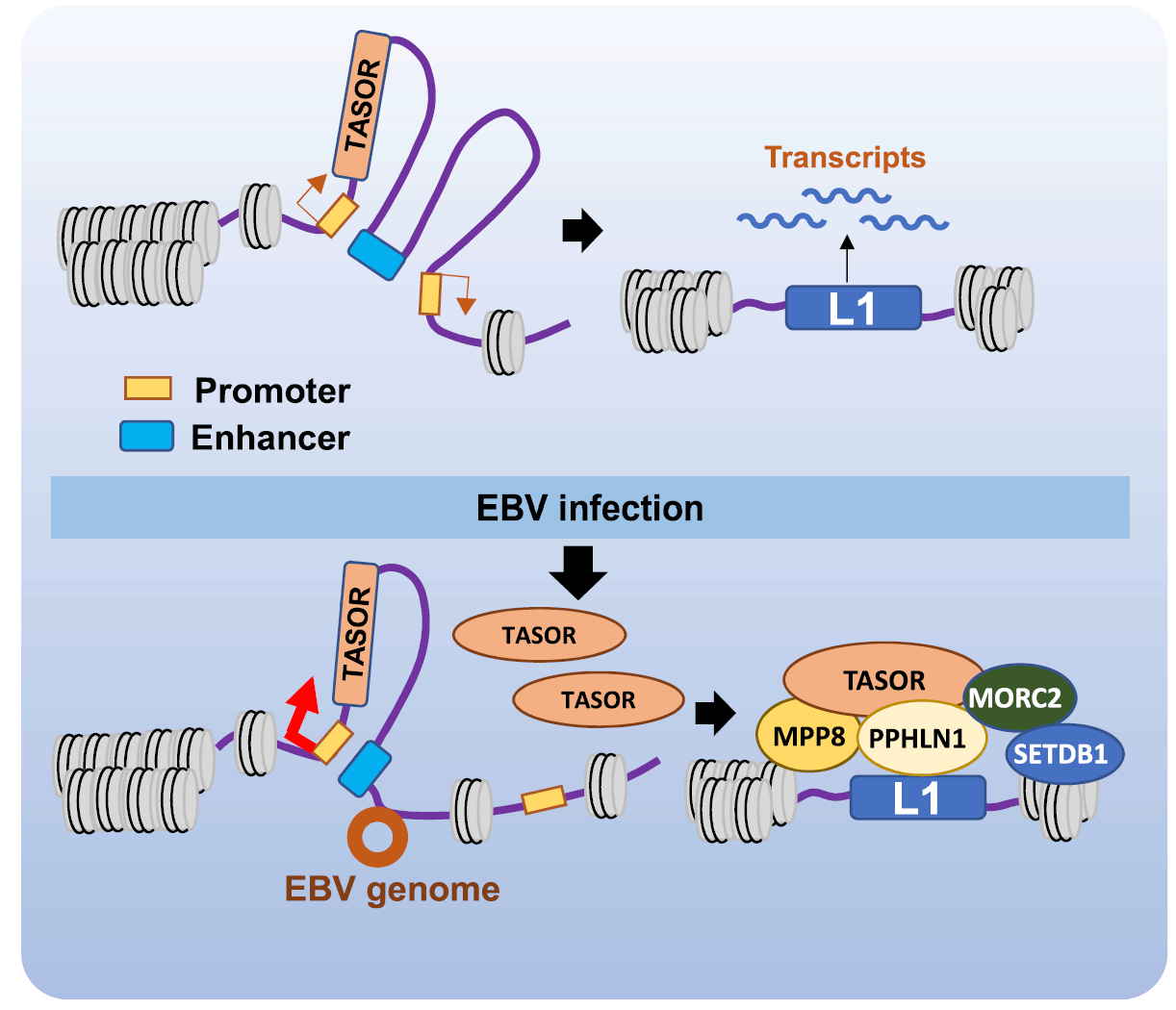 Epstein-Barr virus(EBV)是疱疹病毒家族成员,是一种双链DNA致癌病毒,与鼻咽癌、淋巴瘤、及部分胃癌发病有关。EBVaGC是一种具有独特分子特征的临床胃癌亚型,占胃癌病例的10%左右,然而EBV感染在该亚型胃癌发生发展中的作用仍不清楚。六合彩论坛 何素素/李尔广团队以EBVaGC作为模型,研究了EBV感染对长散布元件LINE-1转座子表达的影响,发现EBVaGC中病毒基因组黏附于宿主HUSH复合物核心蛋白TASOR基因编码区域,导致TASOR增强子和启动子之间相互作用增强,导致TASOR高表达,进而促进HUSH复合物形成,在内含子区年轻全长LINE-1上沉积,抑制LINE-1转座子表达。人类基因组中将近50%的序列为转座子,其中LINE-1转座子占比最高,也是人类基因组中唯一具有自主转座活性的转座子,经由转录-逆转录完成转座周期,可破坏或影响插入位点基因结构和表达,在肿瘤细胞中常出现LINE-1表达失调或异常转座事件,因此可能与肿瘤发生发展有关。课题组从病毒与宿主基因组相互作用的角度阐述了LINE-1表达与EBV相关胃癌(EBVaGC)的关系,为研究病毒感染与癌症等疾病的发生发展提供了新的思路和研究方向。