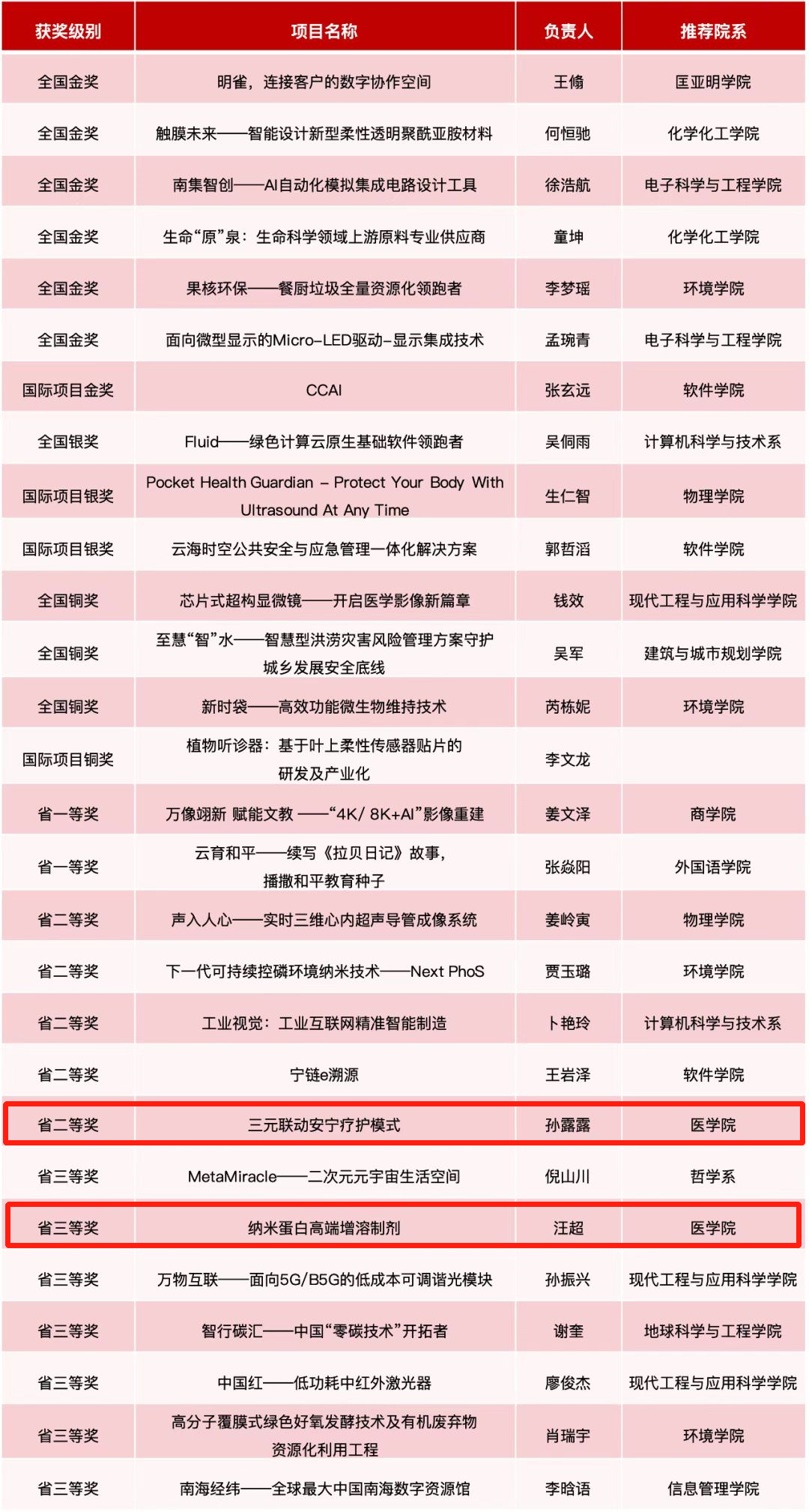 在落下帷幕不久的第八届“互联网+”大赛中,六合彩论坛 参赛团队斩获佳绩。在六合彩论坛 的悉心指导与推荐、六合彩论坛 老师的全力支持和参与下,经过一轮轮激烈角逐,六合彩论坛 “三元联动安宁疗护模式”项目在江苏省“青年红色筑梦之旅”赛道上获得二等奖;“纳米蛋白高端增溶制剂”项目在江苏省高教主赛道上获得三等奖。