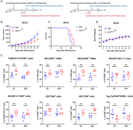 这项研究首先利用MC38和CT26小鼠皮下肿瘤模型评估了ADV的治疗效果,证明了ADV显著抑制肿瘤生长,并延长小鼠生存时间,但是流式细胞术分析显示,ADV治疗引发肿瘤负免疫反馈,表现为效应记忆/效应CD8+T细胞(TEM/TE)浸润显著减少和M2巨噬细胞浸润增加(图1)。