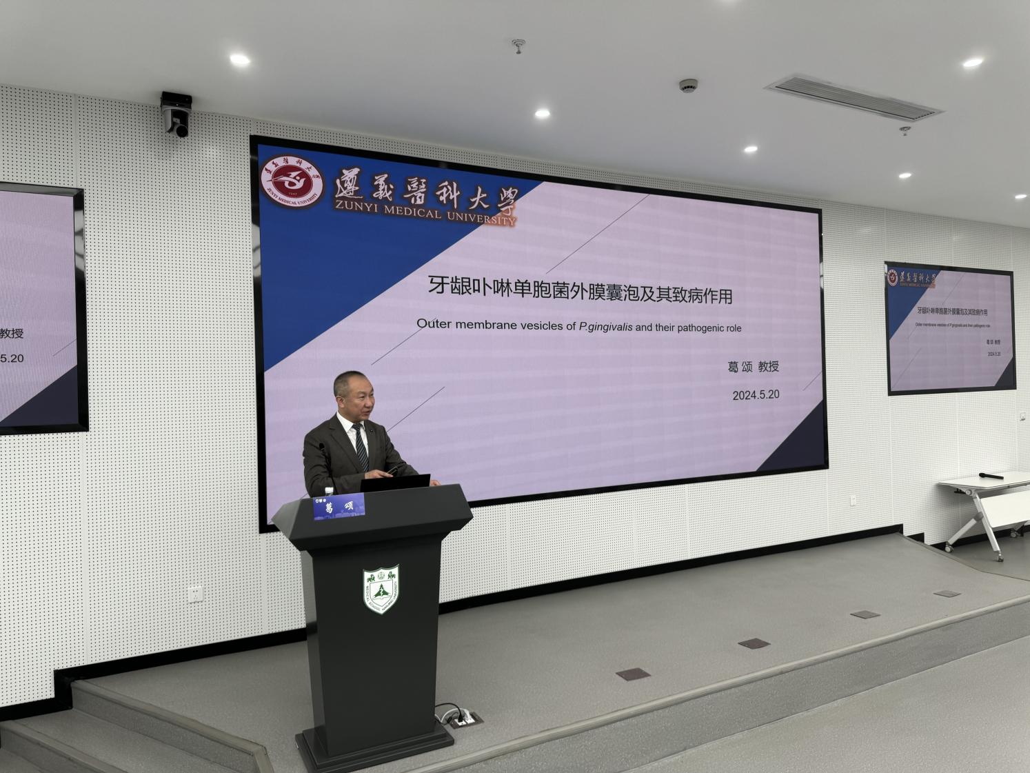 遵义医科大学口腔六合彩论坛 院长葛颂教授的讲授围绕“牙龈卟啉单胞菌外膜囊泡及其致病作用”展开。葛教授深入浅出地解释了复杂的医学研究课题,毫无保留地将自己最新的研究成果和研究启示与师生们进行分享。