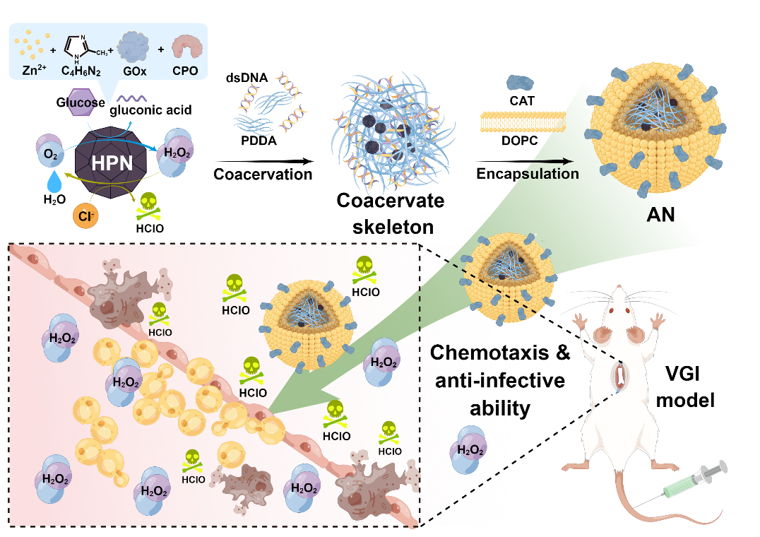 周敏教授课题组构建了生物安全的、能够主动趋化至炎症感染部位并产生次氯酸抗感染的微米级球形AN。团队用金属有机框架结构包封葡萄糖氧化酶和氯过氧化物酶构建了能够产生次氯酸的纳米颗粒。随后,由DNA和另一种带相反电荷的聚合物通过液-液相分离构成了内部包封纳米颗粒的微米级凝聚体AN骨架。最后,由载有过氧化氢酶的磷脂双分子层进行包封,获得了微米级球形AN,既提高了AN的生物相容性,也赋予了其在H2O2浓度梯度中的趋化性。在生理条件下,AN会响应炎症感染部位的高H2O2水平并向炎症位点主动趋化。与此同时,AN还能催化生理环境中的葡萄糖和Cl−释放出次氯酸, 从而高效发挥抗感染能力。为验证AN的上述能力,团队选择了具有高死亡率、高致残率的体内血管移植术后感染性疾病,即血管移植物感染作为对象,通过体内外实验成功验证了AN的趋化行为和抗感染能力。