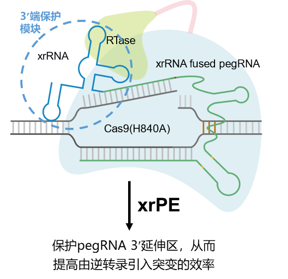 CRISPR-Cas基因组编辑技术在10年前的问世,为生命科学带来了革命。人们随后在提高基因组“改写”精准性上开展了不断的探索。其中,2019年开发的“先导编辑”(prime editingPE)技术,是向着精准编辑基因组目标的一个重要突破。Prime editor的核心由带有逆转录酶结构域的Cas9缺口酶融合蛋白、以及先导编辑guide RNApegRNA)两部分组成。这里,pegRNA除了驱动在靶位点处形成缺口,其3端另含有携带突变信息的延伸序列,可进一步介导缺口链DNA的逆转录。因此,PE能够在规避双链DNA断裂条件下造成精准的碱基突变或小片段插入/缺失。然而,目前整体来看PE的编辑效率仍不理想,这成为其广泛应用的主要瓶颈。