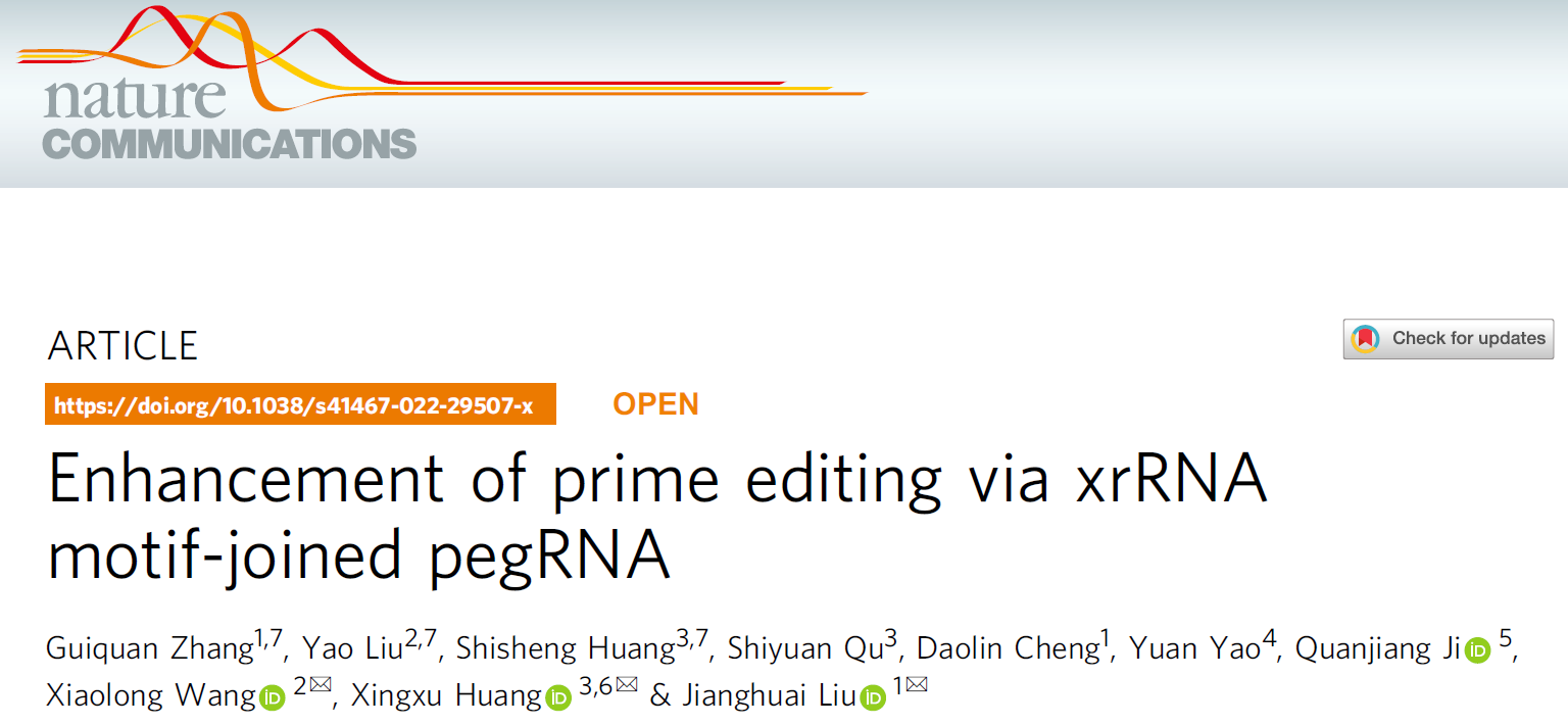 2022年04月06日,这篇题为“Enhancement of prime editing via xrRNA motif-joined pegRNA”的论文发表于《自然-通讯》杂志(Nature Communications)。该工作的第一作者(共同)为六合彩论坛 模式所博士生张贵泉、刘尧(西北农林科技大学)和黄诗圣(上海科技大学);通讯作者分别为刘江怀、黄行许(上科大)与王小龙(西农)教授。研究工作受到科技部重点研发计划等项目的资助。