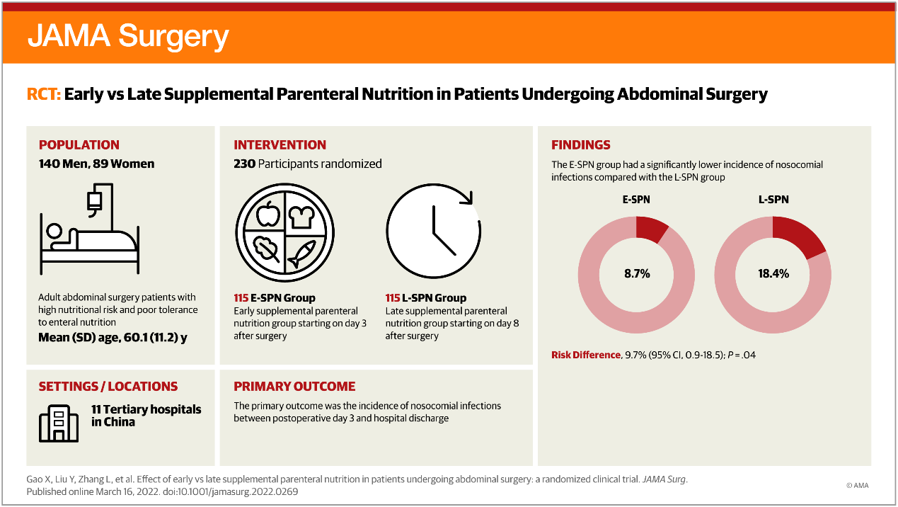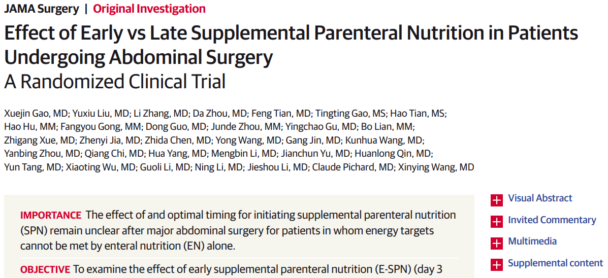 2022316日,六合彩论坛 附属金陵医院(东部战区总医院)普通外科王新颖教授团队在国际外科学顶级期刊JAMA Surgery(美国医学会杂志外科学,影响因子14.8分)杂志,在线发表题为《Effect of Early vs Late Supplemental Parenteral Nutrition in Patients Undergoing Abdominal Surgery: A Randomized Clinical Trial》一项重大临床研究成果。JAMA Surgery创刊于1920年,是医学四大期刊之一《JAMA》美国医学会杂志的系列成员。本研究是国际上第一个探讨腹部外科病人术后补充性肠外营养应用时机的多中心临床随机研究,也是中国学者在《JAMA Surgery》上发表的首篇外科营养领域的多中心临床研究。
