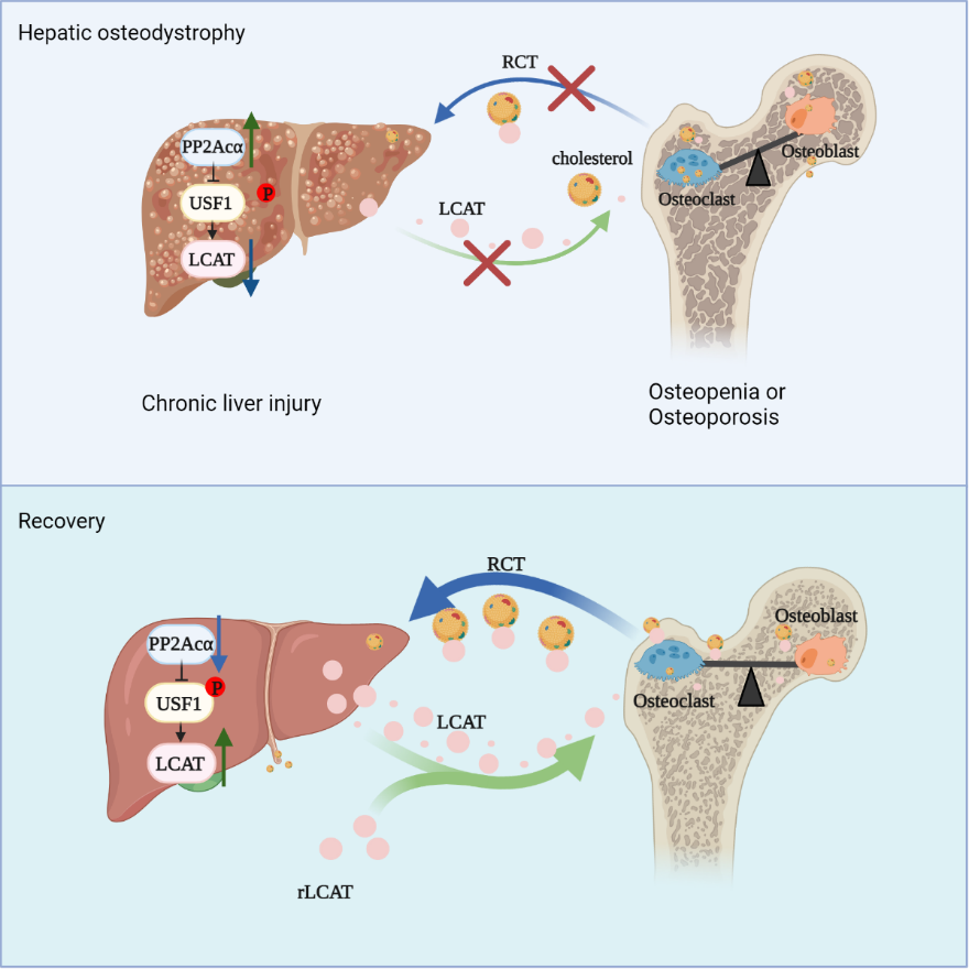 该合作团队首先在肝性骨病的临床患者和小鼠模型中发现,肝细胞表达的磷酸酶PP2Acα水平异常升高,而靶向敲除小鼠肝实质细胞中的PP2Acα可以改善HOD小鼠的肝功能,同时缓解骨量的丢失。该团队通过蛋白质组学等手段筛选出了在这一过程中发挥作用的肝源性因子LCAT,并深入研究了PP2Acα通过去磷酸化转录因子USF1抑制下游LCAT表达的作用机制。LCAT作为一种胆固醇转移酶,可将外周组织的胆固醇转移到肝脏中。该团队发现,LCAT通过维持合适的胞内胆固醇水平,起到促进成骨细胞分化和抑制破骨细胞分化的作用,从而调节骨代谢。此外,LCAT还可通过促进胆固醇从骨到肝的逆向转运缓解肝损伤。在慢性肝损伤病程中,肝脏PP2Acα表达异常升高使得下游肝源性因子LCAT水平表达降低,LCAT在骨稳态的维持中具有重要意义,其水平降低可导致骨量丢失,而肝细胞靶向敲除PP2Acα或外源性补充LCAT可逆转这一过程(图1)。