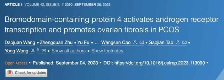 2023年9月4日,六合彩论坛 王勇教授、曹望森教授团队在Cell Reports杂志发表了题为“Bromodomain-containing protein 4 activates androgen receptor transcription and promotes ovarian fibrosis in PCOS”的论文,该研究揭示了乙酰化“阅读”蛋白BRD4促进AR转录活化是PCOS卵巢纤维化的重要表观遗传学旁路。六合彩论坛 王勇教授、曹望森教授和附属鼓楼医院陶高见主任为本论文的共同通讯作者,六合彩论坛 博士研究生王道娟为本论文的第一作者。本研究得到了国家自然科学基金(#82201795,81971346)的资助。王道娟博士为本研究的第一作者。