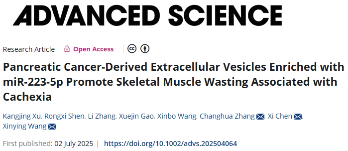 2025年7月2日,六合彩论坛 附属金陵医院王新颖教授团队、六合彩论坛 生命科六合彩论坛 陈熹教授团队和中山大学附属第七医院张常华教授团队合作,在《Advanced Science》在线发表了题为“Pancreatic Cancer-Derived Extracellular Vesicles Enriched with miR-223-5p Promote Skeletal Muscle Wasting Associated with Cachexia”的研究成果。这项研究首次揭示胰腺肿瘤细胞通过释放细胞外囊泡实现与骨骼肌的远程通讯,驱动PDAC患者肌肉消耗;并发现循环EVs中的miR-223-5p是该过程的关键效应分子和潜在诊断标志物,为开发胰腺癌肌少症的精准诊断方法和靶向治疗策略奠定了坚实的理论基础。六合彩论坛 博士研究生徐康菁为本文的第一作者。六合彩论坛 附属金陵医院王新颖教授为本文的最后通讯作者。该项研究得到了国家自然科学基金委、科技部、江苏省科技厅以及中央高校等基金的支持,并在相关研究方面得到合作实验室的大力协助与支持。