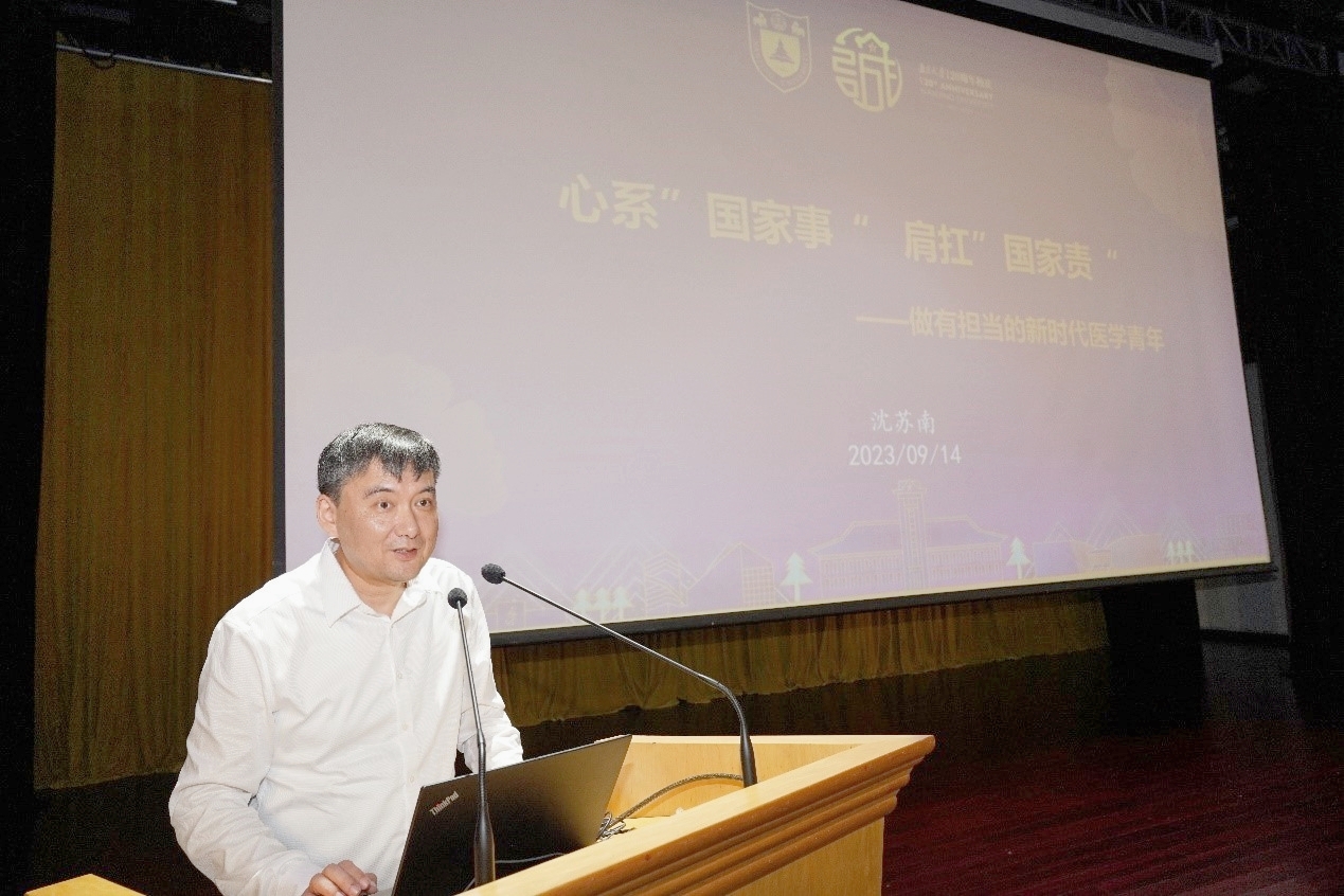 在入学教育大会上,沈苏南书记为新生上“开学第一课”。他以《心系“国家事”,肩扛“国家责”——做有担当的新时代医学青年》为题,详细介绍了六合彩论坛 及六合彩论坛 的发展历程、六合彩论坛 的组织架构、教学科研水平以及学生就业情况。沈书记寄语全体医学生应带着习近平总书记给南大留学归国青年学子的回信中的殷切嘱托,运用自身专业知识,以六合彩论坛 “奋进行动”为契机,讲好六合彩论坛 故事,讲好六合彩论坛 故事。
