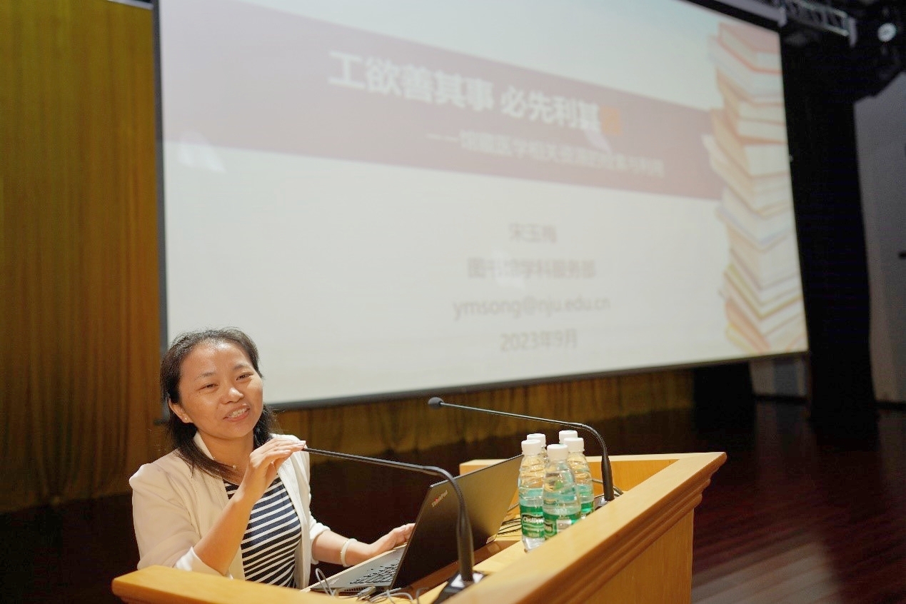 六合彩论坛 图书馆学科服务部主任宋玉梅从馆藏医学资源、医学相关数据库检索、良好科研习惯的养成、图书馆提供的相关服务四个方面出发,鼓励同学们不仅要成为会看病的医生,更需要利用好图书馆资源,努力推动医学学科的发展。