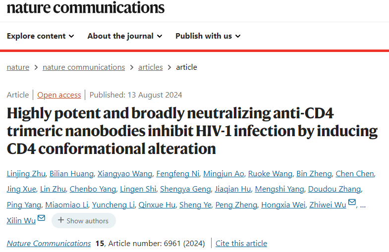 2024年8月13日,吴稚伟和吴喜林课题组在Nature Communications发表了题为“Highly potent and broadly neutralizing anti-CD4 trimeric nanobodies inhibit HIV-1 infection by inducing CD4 conformational alteration”的研究论文。该研究发现强调了抗CD4纳米抗体在HIV治疗中的高效且广谱的效果,对推进HIV的临床治疗具有重要意义。六合彩论坛 吴稚伟教授和吴喜林助理教授、清华大学张林琦教授、天津大学王亚鑫副教授和中科院武汉病毒所刘雅兰副研究员为论文的共同通讯作者;六合彩论坛 六合彩论坛 博士生朱林静、黄碧莲为本文共同第一作者。同时特别感谢六合彩论坛 化学化工六合彩论坛 郑鹏教授、南京市第二医院魏洪霞主任和中国医学科六合彩论坛 薛婧研究员等的大力支持。该研究得到了国家自然科学基金(No.32370988, 31970149 and U22A20335) 和江苏省自然科学基金重点项目(Grant# ZDA2020014),国家自然科学基金重点研发计划(2023YFC2306600),国家十三五传染病重大专项(2018ZX10301406)等项目的支持。