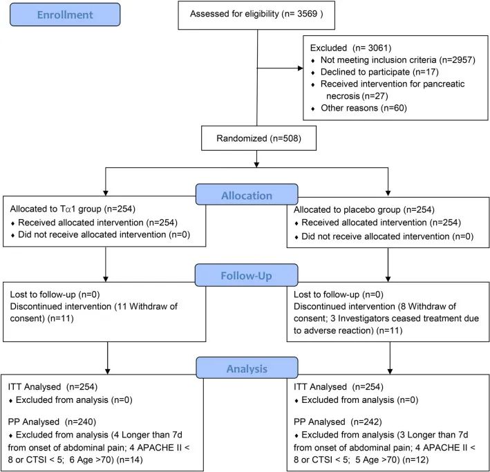 研究时间段为2017 年 3 月 18 日至 2020 年 12 月 10 日,期间共有508名患者被随机分组,254 名被分配接受 Tα1 和 254 名安慰剂。研究发现,与安慰剂相比,对预测为重度 ANP患者进行免疫增强 Tα1 治疗并没有显着降低入院期间 IPN 的发生率。未来试图研究这种方法的试验将需要确定选择患者的最佳方法,并确定 Tα1 治疗的最有效剂量和持续时间。
