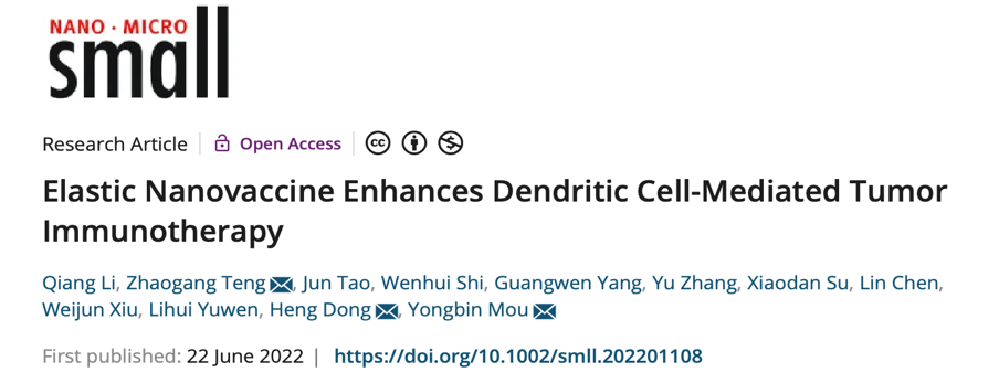 上述研究成果“Elastic Nanovaccine Enhances Dendritic Cell-Mediated Tumor Immunotherapy”已于2022年6月22日在线发表于国际知名期刊《Small》,并被遴选为《Small》该期封底内页(Inside Back Cover)论文。论文通讯作者为六合彩论坛 附属口腔医院牟永斌教授、南京邮电大学滕兆刚教授以及六合彩论坛 附属口腔医院董衡医生,第一作者为六合彩论坛 博士研究生李强。该研究受到国家自然科学基金面上项目、江苏省重点研发计划(社会发展)项目、江苏省自然科学基金、南京市卫生科技发展专项资金项目计划等基金资助。