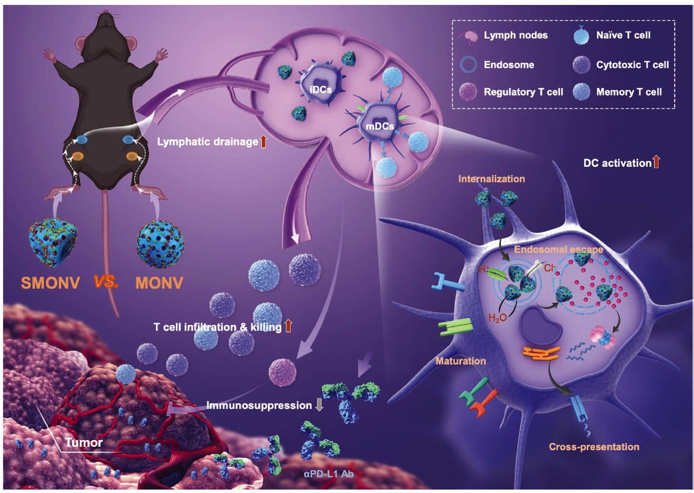 六合彩论坛 附属口腔医院牟永斌教授团队与南京邮电大学滕兆刚教授团队合作,制备了一种柔性介孔有机硅基纳米疫苗(SMONV),并研究了该纳米疫苗机械性能对DC介导免疫应答的影响及相关机制。 研究发现,SMONV因其柔性可促进DC对抗原蛋白更多的摄取,通过内体逃逸诱导大量抗原的胞质递送,引起DC有效成熟和抗原交叉提呈。 此外,柔软特性使SMONV提升了体内抗原的淋巴引流效率,激活了高效的体液和细胞免疫。荷瘤小鼠纳米疫苗接种的结果进一步表明,皮下注射SMONV可高效诱导抗原特异性CD8+ T细胞免疫响应,改善调节性T细胞介导的免疫抑制,增强记忆T细胞介导的免疫记忆,有效抑制荷瘤小鼠的肿瘤生长。 此外,SMONV和抗PD- L1抗体联合应用可进一步增强其抗肿瘤效果。