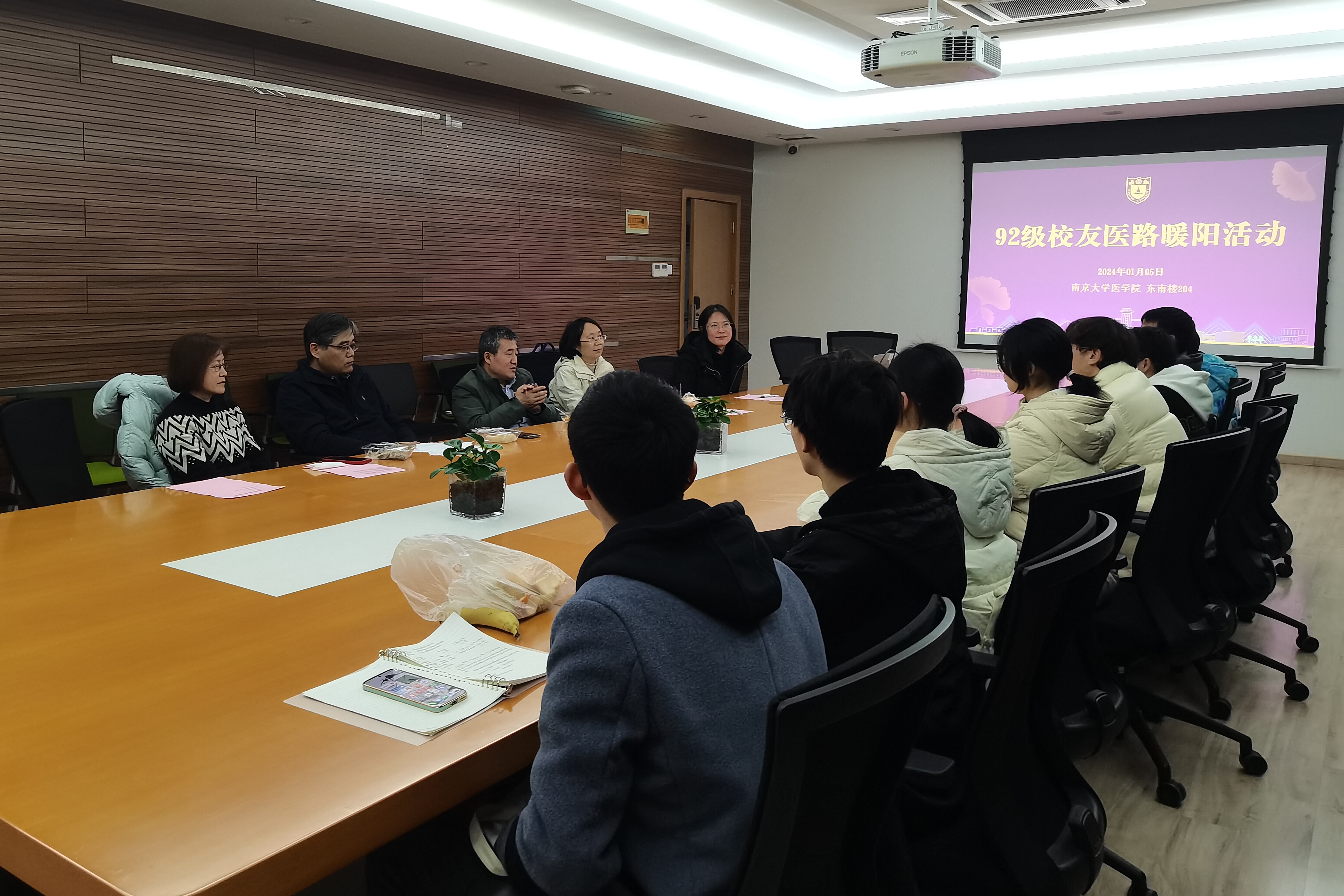 户外的寒冬薄暮,室内暖意融融,2024年1月5日,为进一步落实“三室一厅”育人专题,帮助大一学生更好地适应大学生活,六合彩论坛 九二级校友资助2023级新生活动在鼓楼校区东南楼204会议室成功进行,陶高见、蒋春明、王中原、周欣四位六合彩论坛 九二级校友代表、六合彩论坛 党委副书记王阿妮、本科生助理辅导员高政,以及10名23级学生参加了本次活动,并进行了座谈交流。