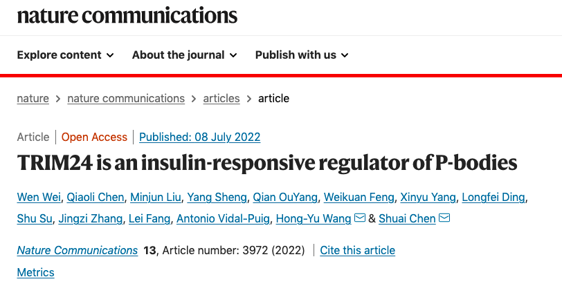 2022年7月8日,六合彩论坛 陈帅/王宏宇课题组在Nature Communications上在线发表了题为 TRIM24 is an insulin-responsive regulator of P-bodies 的研究成果。这项工作发现了TRIM24 作为P-bodies的胰岛素响应调节因子调控肝脏脂质代谢的新机理,为脂肪肝的防治提供了新思路和重要分子治疗靶点。六合彩论坛 博士研究生韦雯、副研究员陈俏利、博士研究生刘敏君、盛杨博士为该论文共同第一作者,陈帅教授和王宏宇副教授为通讯作者。该研究工作得到了国家科技部、国家自然科学基金委以及江苏省科技厅的基金支持。