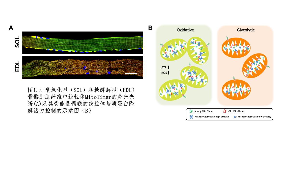 Timer是一个早年建立的荧光光谱可在一定时间内发生特定转换的荧光蛋白(定义为由绿色荧光转换为红色荧光),MitoTimer则是能够定位于线粒体基质的Timer蛋白。将Timer(MitoTimer)在细胞中表达后,虽然Timer的两种荧光光谱似乎能反映细胞(或线粒体)中“新”、“老”Timer蛋白的构成,但其整体荧光光谱(红绿比)可能受到多种因素的影响,Timer的这种随时间改变光谱的特性或Timer的荧光光谱用于研究生物学过程的最佳场景尚不明确。六合彩论坛 模式动物研究所的刘耕课题组通过建立MitoTimer的小鼠报告系统并解析生理稳态下小鼠骨骼肌中MitoTimer的荧光光谱,首次发现处于不同氧化代谢水平的骨骼肌组织和肌纤维中MitoTimer荧光光谱存在巨大差异(如:氧化代谢旺盛的慢肌纤维以绿色荧光为主,而以糖酵解为主要代谢模式的快肌纤维则以红色荧光为主)。同时,年轻小鼠以及锻炼后小鼠骨骼肌MitoTimer均呈现偏绿荧光光谱。在细胞体系中,提升氧化代谢水平同样能促进MitoTimer偏绿光谱的呈现。进一步的研究排除了线粒体自噬以及生物合成等多种因素对氧化状态下MitoTimer荧光光谱的影响,揭示线粒体基质蛋白水解酶的活力直接影响了MitoTimer的降解速率,尤其是MitoTimer红色荧光的强度,是决定MitoTimer荧光光谱的主要因素,而这种“新”、“老”蛋白降解动力学的内在区别可能正是Timer特性的在活细胞中的反映。重要的是,线粒体蛋白酶活力、MitoTimer以及线粒体呼吸链蛋白降解和更新都与线粒体能量状态和水平紧密偶联。因此,偏绿的MitoTimer荧光光谱界定和指示了线粒体的一种活跃状态,即特定氧化代谢状态下供能效率的提升(高氧化磷酸化水平)。线粒体蛋白酶作为线粒体重要的质量控制系统,负责线粒体电子传递链蛋白复合体的组装以及损伤蛋白的清除等功能,因此该研究的发现提示线粒体高氧化磷酸化状态存在正向反馈的维持机制。更多实验结果也证实这种线粒体的活跃状态反而伴随着较低活性氧/氧化损伤以及线粒体自噬水平,显示出线粒体代谢适能的特定状态。综上,MitoTimer偏绿荧光光谱的解析揭示了与线粒体高水平氧化磷酸化状态相偶联的质量控制机制,并指示高效而低氧化损伤的特定线粒体活跃状态。