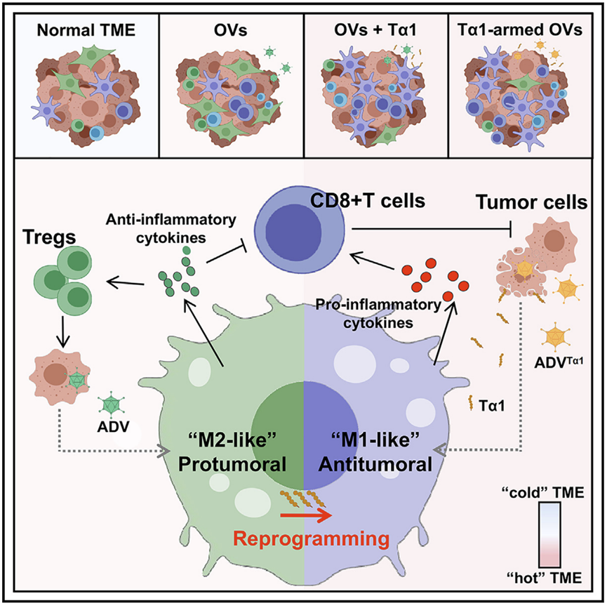 在最近的研究中,吴俊华/江春平团队发现ADV诱导的免疫抑制反馈回路降低了抗肿瘤免疫,而Tα1 可以通过逆转 ADV 诱导的免疫抑制细胞扩增来增强抗肿瘤功效。此外,他们还设计了一种表达 Tα1 的重组溶瘤腺病毒(ADVTα1),与联合治疗相比,它具有优越的免疫调节作用和抗肿瘤疗效,具有良好的临床应用潜力。