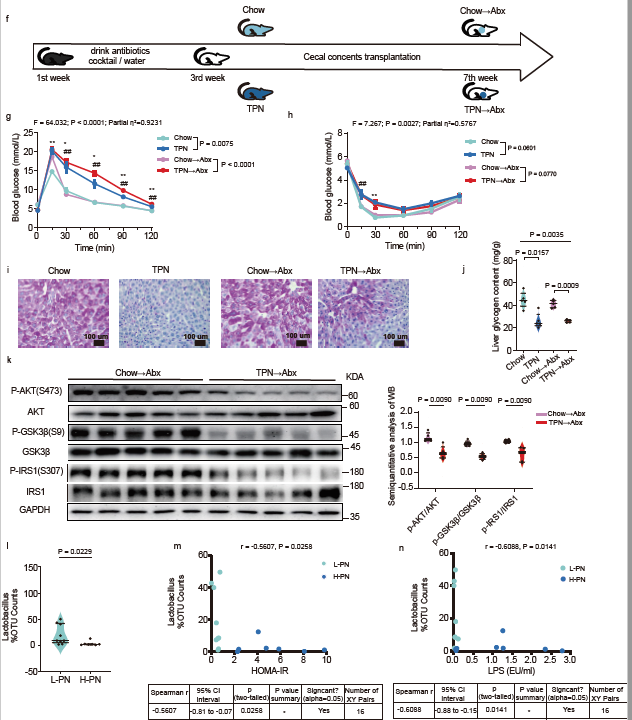 Considering that the gut microbiome disorders can affect the homeostasis of metabolism, Xinying Wang’s group performed 16s RNA sequencing for TPN mouse model and patients with intestinal failure. Results showed that the abundance of Lactobacillus was significantly decreased in the TPN mice and H-PN patients. Meanwhile, the off-target metabolomics of mice suggested that the tryptophan metabolic pathway, which is closely related to Lactobacillus, was significantly down-regulated, and the indoleacetic acid (IAA) was most significantly reduced in the intestinal contents of mice and the blood of H-PN patients. In addition, Abx mice (a mouse model without gut microbiota) receiving intestinal contents from mice receiving TPN developed glucose metabolism disorders. These results suggest that gut microbiota and its metabolites may play an important role in total parenteral nutrition-related glucose metabolism disorders (Fig.2).
