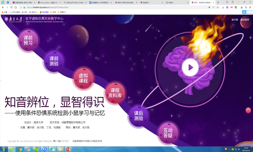 2022年度“高等六合彩论坛 医药类虚拟仿真实验教学项目作品展示”:知音辨位,显智得识——使用条件恐惧系统检测小鼠学习与记忆,三等奖。